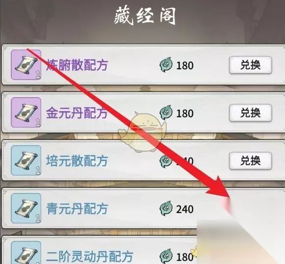 3、在弹出的丹药配方中,找到青元丹并点击兑换;