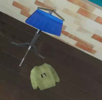 在一个小衣架下有一件黄色衣服,与上面干净的蓝色裙子显出对比。黄色衣服脏乱且带有数字“17”有点像编号