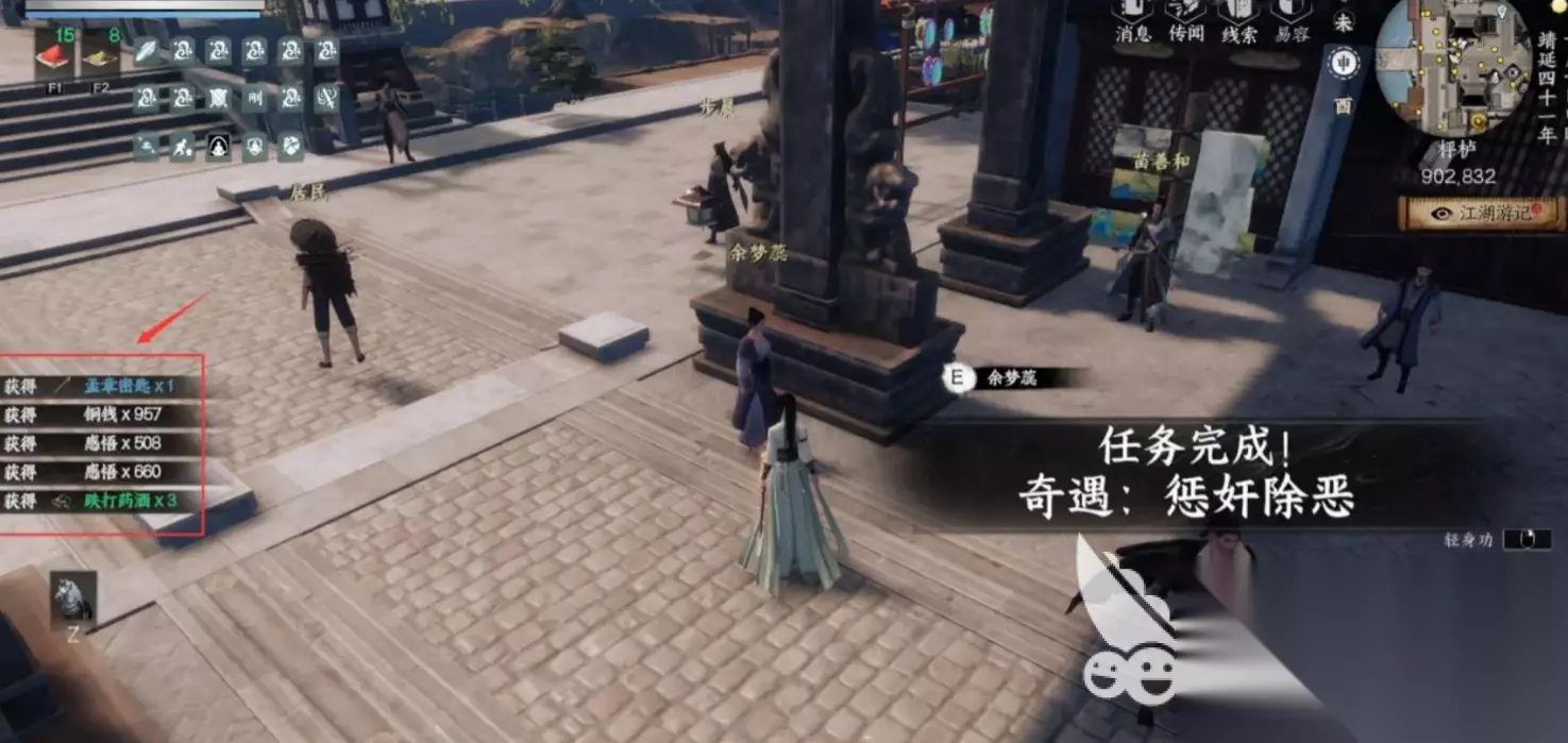 孟章密匙需要完成“惩奸除恶”奇遇。在坐标(901.829)会自动触发与余梦蕊的剧情,选择“出十两”即可继续剧情。此后会进入战斗,击败马启等人后再触发与谭彦杉的剧情。在(864.773)击败陈累并将账本交还谭彦杉,再与余梦蕊对话即可获得孟章密匙。