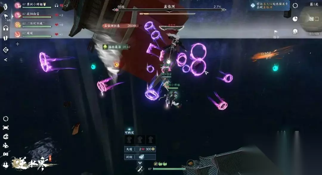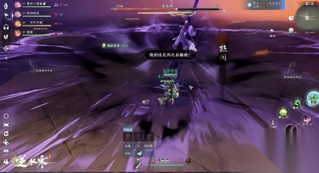 第二阶段:BOSS释放雌雄剑气,看到提示后需要第一时间跨越到其他平台,拉断连线避免减员,若战斗拖得太久,孟临渊释放狂澜时,巨剑将提前碎裂,不可掉以轻心,碧云问舟技能是个不错的选择,输出职业也考虑带上。