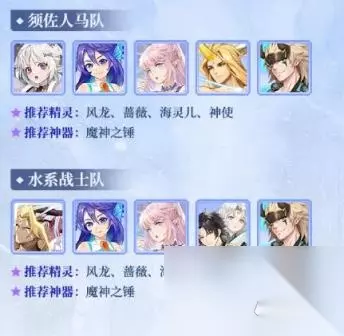 水系战士队 成员:盘古、娜迦、塞壬、麒麟、须佐之男。 推荐精灵:风龙、蔷薇、海灵儿、神使。 推荐神器:魔神之锤。