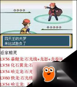 冠军小茂 lv59大比鸟 lv59铁甲暴龙 lv57富迪 注意:最终天王尾三只精灵会因应我方开头拣选的精灵而出现影响 开头拣选: a.小火龙 b.车里龟 c.奇异种子 的话,尾三只精灵就会是: a.奉神犬,椰树兽,水箭龟 b.鲤鱼龙,奉神犬,奇异花 c.椰树兽,鲤鱼龙,喷火龙 前三只则不变 祝阁下好运! 战斗胜利后,你会返回纯白镇,但未算是破关。 而且仍未能收服超梦梦,不能传精灵至蓝宝石/红宝石 你还要去香橙四、五、六、七岛处理一个秘密 香橙篇 到达需求: 已经收服了到60只宠物小精灵 然后找大木博士升级图鉴 去四大王王,发现不能进去挑战 于秋色市乘船,去香橙群岛1的PC问右边机器前的男士 去捉火鸟的山顶,一入去转右见到2名火箭兵团成员,突然多了一个洞 同2名火箭兵团成员战斗,入去找一粒红宝石,山洞不算复习(要推石),而且在二楼首次出现金银精灵,到深处发现很多排点字,再下楼梯,见红宝石一粒,拿走它。注意一下,在同层墙壁上亦出现了点字! 找到后返回找上图男士 现在,于岛一码头可坐船到岛四、五、六、七,完成! 在香橙四、五、六、七岛,每个岛均相隔甚远 香橙四、五岛属第三区域 香橙六、七岛属第四区域 来往每个区域须要于码头乘船,在同一区域内可用飞行来往 在香橙四、五、六、七岛,你会多次遇上宿敌,但不用战斗。最令人鼓舞的,是终于有金银版精灵出现了,而且可以随意收服! 岛上大部分地方的背景音乐亦转为熟悉的金银版音乐!XD 而岛上训练员大多都是用金银版精灵,而且等级很高(普遍都是Lv.50左右) 超梦梦+R/S联机篇 为什么战胜五大天王后仍不能收服超梦梦?又不能与R/S联机? 首先,到岛4,在最右边冰洞里得到秘传招式07(冲上瀑布),之后从一开始进来的瀑布处爬上去,有个洞 进去后见四天王之一的科拿及火箭兵团成员,与火箭兵团成员对战 然后去岛6南边,在最南边的山洞点字门前用砍树打开秘道 进去后,跳面前的洞,然后,跳最上边的洞,跳下你会发觉和刚才的地方一样,不紧要,接着跳最左边的洞 然后跳最右边的洞,接着跳最下边的洞 就可以到达了,发现蓝宝石,但被人抢去, 然后到岛5最右下角的火箭兵团仓库,现在能进去了 经过一番努力,找到刚才抢宝石的博士(右上方),战胜他,得到蓝宝石,回去岛1PC交给站在机器前的人,现在可以与蓝宝石/红宝石对战/传输,亦能进超梦梦山洞了! 提提你:你要在山洞里用上招式06(破石)及招式03(游泳),建议带备救生绳作离开用。 超梦梦山洞结构非常复习,要多花功夫熟习路线,而且像迷官一样,很多楼梯,很多死路,小心被混淆! 建议花多些时间熟习路线! 超梦梦在地底三楼一个台上 只此一只,一定要收服��喔! 超梦梦速度很高,小心,��亦不易应付! 提示:你亦可以使用极级球收服�� 超梦梦Lv.70无性别 注意:当阁下处理完香橙群岛,成功拿了蓝宝石及红宝石,可以收服超梦梦的话 五大天王挑战大门就会重开,而且实力会加强,等级高了很多 而且会使用金银精灵,有时间可去挑战一下! 收服超梦梦完,继续香橙群岛之旅 回到岛5,在左上角岛上问一名男子可得小刺蛋的蛋(需有一个空位) 现在,请您找一名女子,向右走,游至かえらずのあな,这是一个很奇怪的洞穴,一上楼梯若不依次序走,永远会回到同一层楼(留意清楚登山男子该层其实上下左右有四个洞!) 经过国内网友分享,如下走可得到四样道具及找回该名女子 上楼梯后,以登山男子该层为起点: 1.入右边洞,再入下面的洞,得道具 2.回起点(只要再乱入任何一个洞即可),入右边洞,再入上面的洞,再返回下面的洞,见一名小女孩(战斗),再入上面的洞,得道具 3.回起点(只要再乱入任何一个洞即可),入右边洞,再入上面的洞,再返回下面的洞,再见到该名小女孩,入下边洞,再入右边的洞,再入右边的洞,得道具 4.回起点(只要再乱入任何一个洞即可),入右边洞,再入上面的洞,再返回下面的洞,再见到该名小女孩,入下边洞,再入右边的洞,再入左边的洞,再入下边的洞,再入左边的洞,得不思议糖果 5.回起点(只要再乱入任何一个洞即可),入右边洞,再入上面的洞,再返回下面的洞,再见到该名小女孩,入下边的洞,再入右边的洞,再入左边的洞,再入下边的洞,再入右边的洞,再入上边的洞,见该名女子(战斗) 战斗完后会回到她的家 到岛6左上角的ヘんげのどうくつ,发觉是空的 到岛7,北边是战斗塔,有时间可进去挑战(注意:训练员等级全部都在Lv.60以上) 在岛7向南边走,经过桥及一些草堆,在中途分叉路往左走,草堆旁边发现山洞,进去用智慧将七只石推到七个洞坑上,开动机关 提示:别让石头位置欺骗及不要贪方便,最入边尾二的两只石并不是推入旁边的洞坑,请先推最近入口的两只石到洞坑,亦请暂时勿急着移动一些石头,以留空位给自己过路。 成功后,机关已开,离开山洞,往最南边游泳,发现八个遗迹。因为你已经开了机关,所以现在你进去可遇到像英文字母的精灵No.201未知(Lv.25),总共廿八只!