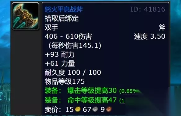 魔兽世界游戏中拥有非常多的武器装备,怒火平息战斧是一件不可替代的武器,其伤害是非常高的,属性也非常赞。 魔兽世界怒火平息战斧怎么获得: 答:痛苦斗兽场的冠军任务奖励。 1、这把武器在DK75级到80级是一直可以使用的武器升级。 2、武器的秒伤非常高,而且属性也是比较优秀的。