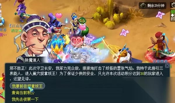 梦幻西游长安保卫战活动中总共有3个不同的阶段,其中前两个阶段是比较简单的,第三阶段比较困难,也是玩家经常说的进洞,在这里总共需要打7场战斗,其中1个大boss和6个小boss。 梦幻西游长安保卫战进洞攻略 1、首先我们在第三阶段开启后找除魔道人,选择前往捉拿妖王,就能直接传送进洞。 2、进洞后需要打7个怪,先打6个小boss,再打最后的大boss,下面依次讲解这些boss的打法。