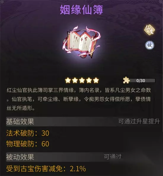 红尘仙官执掌三界万灵结缘之事,在瑶池一人之下万人之上,世间万千因果皆经她手。她观红尘万载,却仍困其中,未历情劫,无以斩断尘缘,也因此境界停留在大罗数万载。 红尘仙官司掌三界情缘,世间姻缘皆录入此簿,仙官执笔,可牵尘缘,亦可断孽缘。修士若得此宝,获尘缘之力庇护,可减免所受到的古宝伤害。