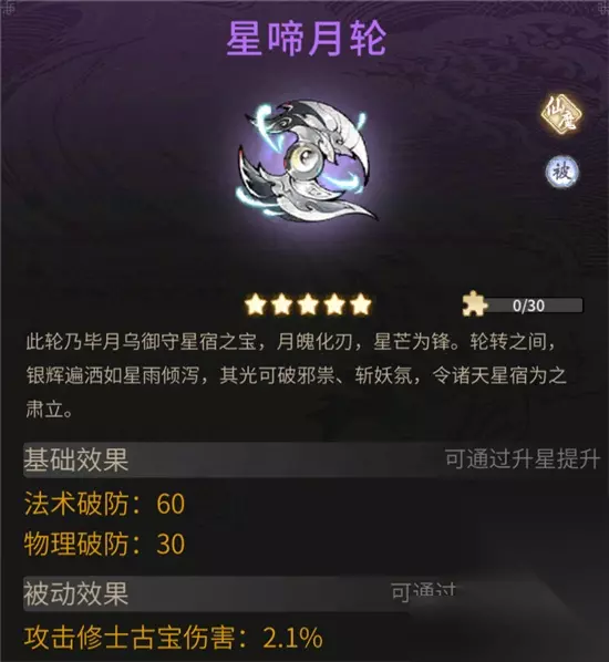 毕月乌乃二十八星宿中资历最老的存在,曾历仙魔大战,后受九星元祖所托为小辈沉姜护道。她将沉姜视作亲人,在得知他触怒天帝被剔除仙骨后,她选择与天庭为敌,给予沉姜一线变数,最终她离开了北极星宫。 毕月乌凭此轮御守星宿,轮转之间,漫天星辉,其光华可破邪祟、斩妖氛。修士拥有此宝便可提升攻击修士古宝伤害,锐不可当。 4.红尘仙官