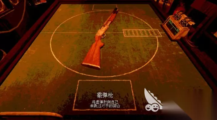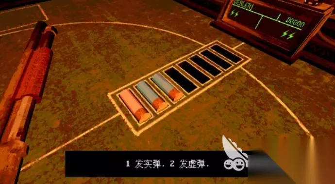 游戏最开始的时候,玩家会进入一个昏暗的房间,然后和恶魔坐在桌子两边。桌上摆着一把霰弹枪,这把枪就是整个对局的核心。恶魔会往枪里装子弹,有实弹也有空包弹,数量每轮都不太一样。比如第一轮,可能是两发空包弹加一发实弹,后面难度上来了,实弹会变多。装好子弹之后,双方就开始轮流选择开枪的目标,可以朝对方开,也可以朝自己开。