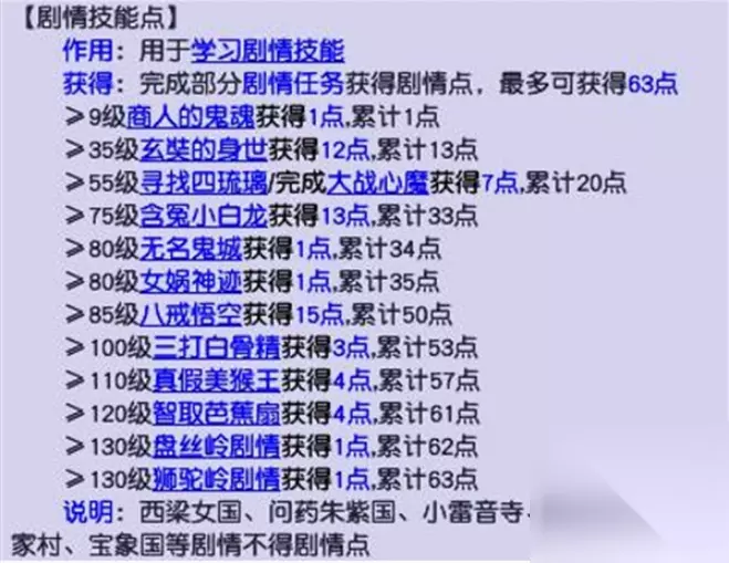 梦幻西游剧情技能点奖励表2024 完成部分剧情任务获得剧情点,最多可获得63点 (1)9级商人的鬼魂获得1点,累计1点剧情点。 (2)35级玄奘的身世获得12点,累计13点剧情点。 (3)55级寻找四琉璃/完成大战心魔获得7点,累计20点剧情点。 (4)75级含冤小白龙获得13点,累计33点剧情点。 (5)80级无名鬼城获得1点,累计34点剧情点。 (6)80级女娲神迹获得1点累计35点剧情点。 (7)85级八戒悟空获得15点,累计50点剧情点。 (8)100级三打白骨精获得3点,累计53点剧情点。 (9)110级真假美猴王获得4点,累计57点剧情点。 (10)120级智取芭蕉扇获得4点累计61点剧情点。 (11)130级盘丝岭剧情获得1点,累计62点剧情点。 (12)130级狐驼岭剧情获得1点,累计63点剧情点。 注意:西梁女国、问药朱紫国、小雷音寺、蓬菜健岛、墨家村、宝象国等剧情不得剧情点。 剧情技能点表一览: