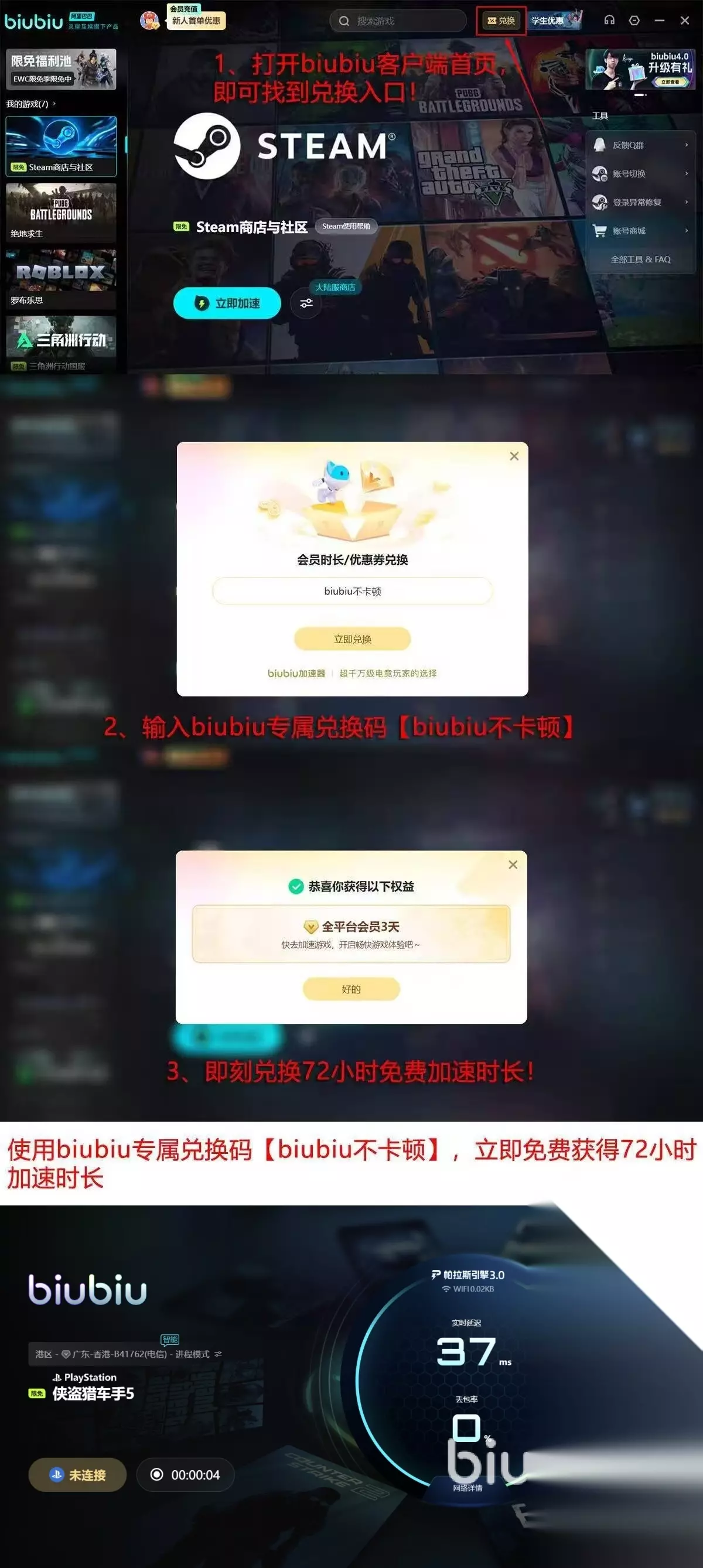 而在专业的加速性能下,还为新人用户准备了丰厚的福利,初次的登录平台会自动提供24h提速福利,这个不需要手动领取直接到账。让伙伴们能过第一时间免费感受提速的效果。除此之外平台为所有人提供了三天的体验时间,只要用户在对应兑换入口输入【biubiu不卡顿】,就能领取到手,但是一定要记住是小写字母。这个兑换口令,平台的所有用户都能使用。
