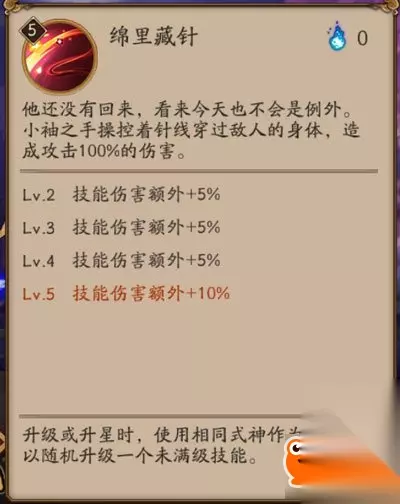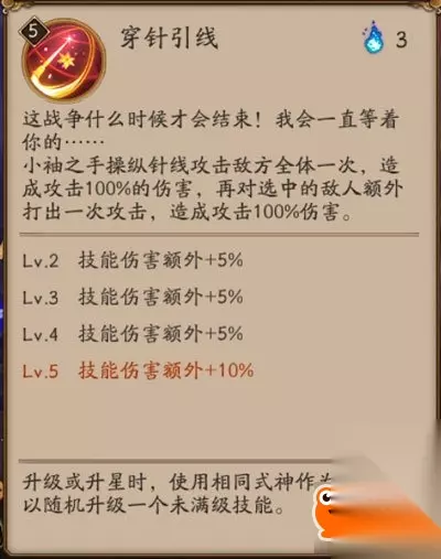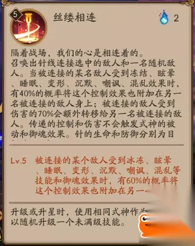 丝缕相连:小袖的核心技能。 连接两名敌方单位,传递其中一名敌方单位受到的伤害(承受伤害的70%)及控制效果(满级60%概率,冰冻、眩晕、睡眠、变形、沉默、嘲讽、混乱)。可同时传递多个控制效果。每个控制效果单独有60%概率被传递。如阎魔的变形和沉默,就可以同时传递过去。