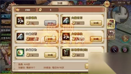 可以通过当票到当铺兑换材料,兑换的内容是可以通过刷新来更替的。免费的4次花钱的20金可以刷10次,每天一共是14次刷新。 当票的获取方法
