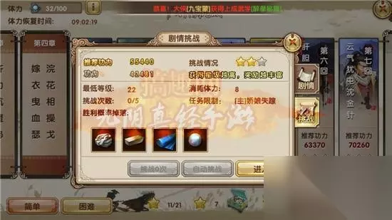 不管是剧情扫荡还是手动挑战,材料都会掉落。当然并不会是100%掉落的所以如果5次挑战结束后还是没有出自己想要的材料就要选择其他的剧情挑战来获取了。 剧情挑战玩法 方法二:当铺兑换