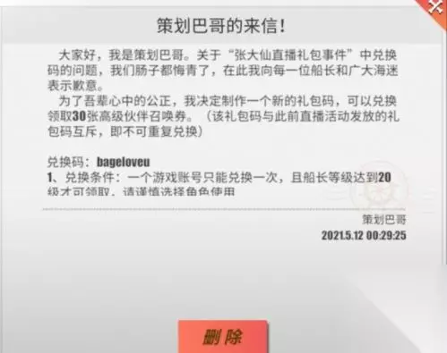 张大仙热血航线事件解决方法: 官方公告给予30礼卷。 策划巴哥的来信 大家好,我是策划巴哥。关于“张大仙直播礼包事件”中兑换码的问题,我们肠子都悔青了,在此我向每一位船长和广大海迷表示歉意。 为了吾辈心中的公正,我决定制作一个新的礼包码,可以兑换领取30张高级伙伴召唤券。 (该礼包码与此前直播活动发放的礼包码互斥,即不可重复兑换) 兑换码:bageloveu 1、兑换条件:一个游戏账号只能兑换一次,且船长等级达到20级才可领取,请谨情选择鱼色使用。