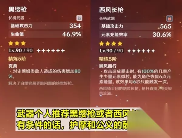 武器选择 个人最推荐黑缨枪和西风枪这两把武器。黑缨枪不用多说,三星武器成本低,加的生命还多;西风枪则是可以帮助她自己和队友充能,加强功能性。当然同样加生命的护摩和枫丹锻造武器公义的酬报,要是有条件的话也可以给夏沃蕾带上,不过黑缨枪绝对足够用了。