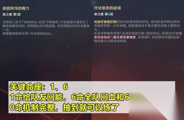 命座分析和抽取建议 夏沃蕾最关键的两个命座是1命和6命。1命可以给场上的队友回复能量;6命则是有额外全队治疗的同时,最多可提供60%的火和雷元素增伤,进一步提高队伍上限。不过夏沃蕾本身就已经机制完整,加上在部分超载队中可以解放班尼特,0命就值得练了。