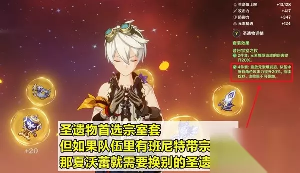 圣遗物选择 最推荐的是宗室套。夏沃蕾大招CD只有15秒,宗室套理论上能做到80%的覆盖率,并且超载队角色大多都需要攻击力加成,所以相当契合。不过要注意的是,如果队伍里有班尼特带宗室套的话,夏沃蕾需要换成其他圣遗物,因为宗室套的加攻不可叠加。