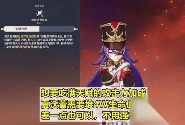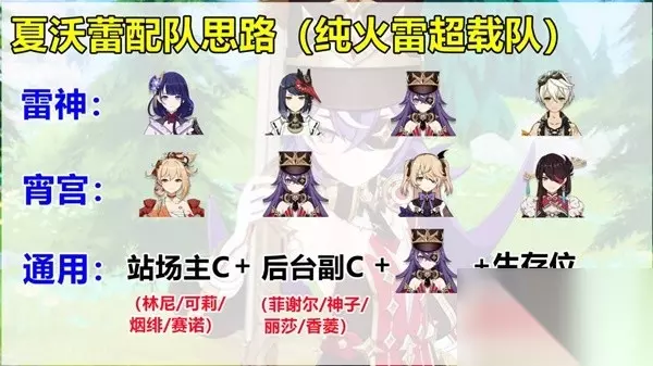 配队选择 因为天赋的关系,夏沃蕾最适合的配队肯定是纯火雷角色的超载队;而从功能性来说,夏沃蕾和班尼特有不少相似的地方。因此夏沃蕾在部分超载配队中,解放班尼特的位置,让他能去别的队伍。