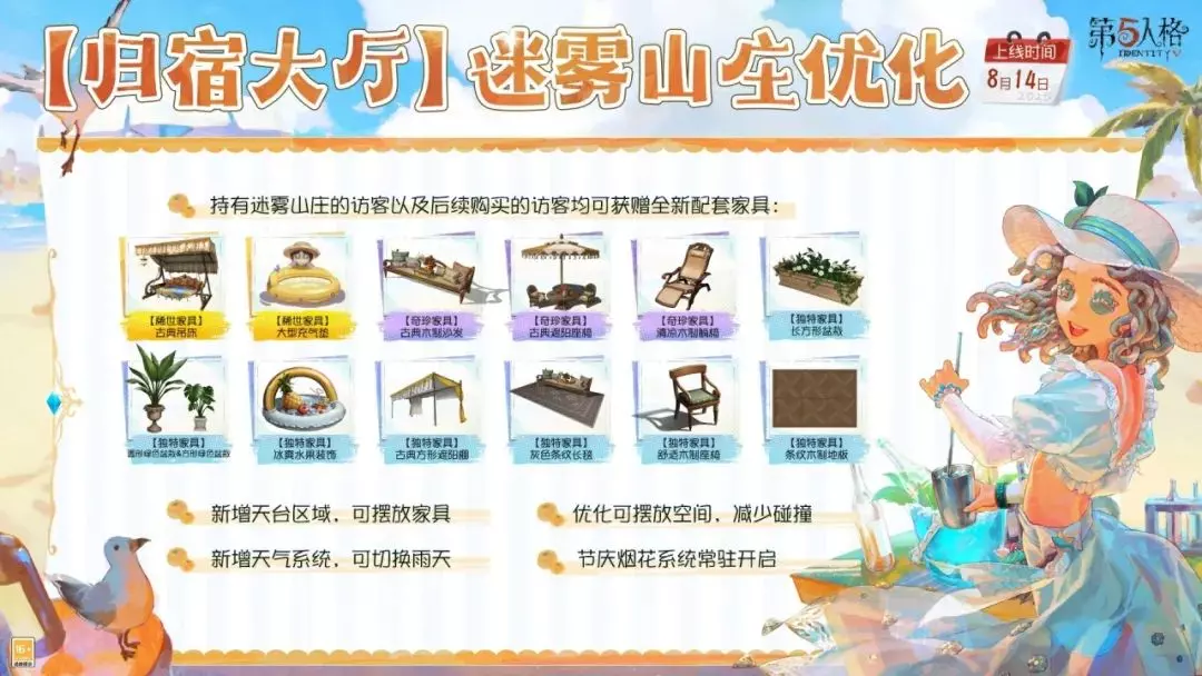归宿系统、【归宿大厅】迷雾山庄、部分典藏家具的优化也将同步上线!持有【归宿大厅】迷雾山庄的访客以及后续购买的访客均可获赠全新配套家具。