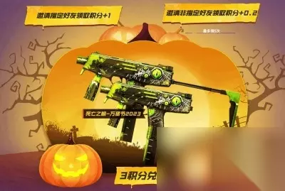 活动奖励: 1.死亡之眼-万圣节2023(玩家使用3好友积分兑换)。 2.兰-空鹰(玩家使用1 好友积分兑换)。 3.裁决-百城联赛冠军天津皮肤(玩家在后续时间可使用积分兑换) 4.毁灭-武装商船(玩家在后续时间可使用积分兑换)。 5.M4A1-S-万圣节2023(玩家任意一局游戏即可)。 6.南瓜头、南瓜背包、南瓜面具、镰刀-万圣节2021。