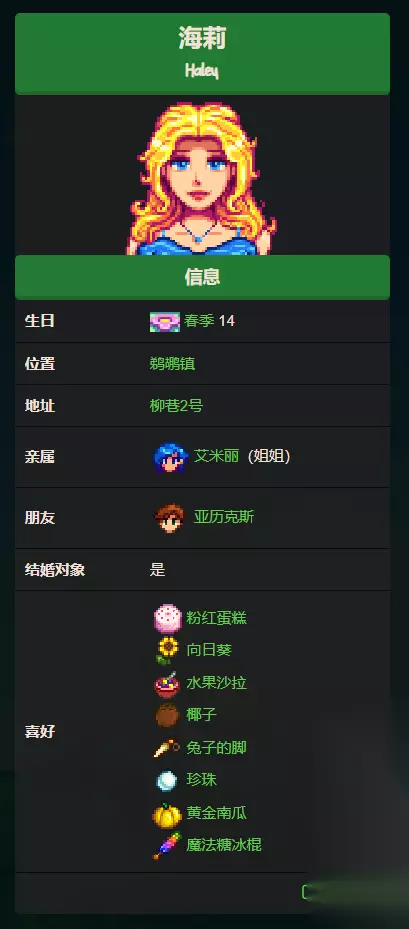 前期想要提升海莉的好感主要靠春天的黄水仙,黄水仙是海莉喜欢的物品之一,如果山洞选择了果蝠,那么恭喜你,海莉喜欢所有的果树果实,同时前期容易获取的还有枫糖浆和星之果实餐吧出售的咖啡。 在中期想要提升海莉好感可以靠向日葵和椰子,这两个相对容易获取。 注意海莉还是唯一一个讨厌五彩碎片的NPC,其余的所有NPC都对五彩碎片是最喜欢的程度。
