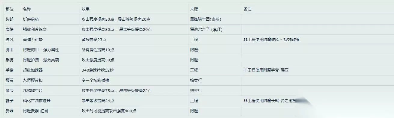 《魔兽世界》怀旧服WLK武器战附魔推荐 头部 折磨秘药:攻击强度提高50点,暴击等级提高20点 肩膀 强效利斧铭文:攻击强度提高50点, 暴击等级提高20点 披风 高弹力衬垫:敏捷提高23点 胸甲 附魔胸甲 - 强力属性:所有属性提高10点 手腕 附魔护腕 - 强效突袭:攻击强度提高50点 手套 超级加速器:340急速持续12秒 腰带 永恒腰带扣:多一个棱彩插槽 腿部 冰鳞腿甲片:攻击强度提高75点, 暴击等级提高22点 鞋子 硝化甘油推进器:暴击等级提高24点 武器 附魔武器-狂暴:攻击时可能提高攻击强度400点