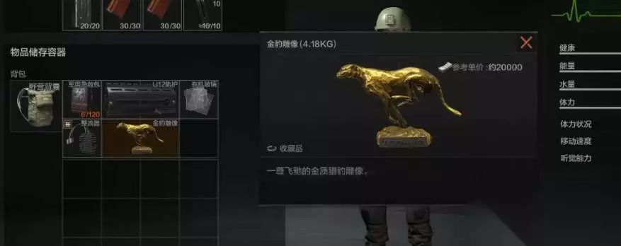 3、金豹雕像出售价格为20000柯恩币,是价值非常高的道具,但是会占用背包两个格子,重量也比较重,大家在携带的时候要注意空间管理; 4、除了金豹雕像之外,游戏中还有金狮雕像等收藏品,这些道具出售价格都很高,但是缺点是占格子,需要玩家合理的取舍携带。