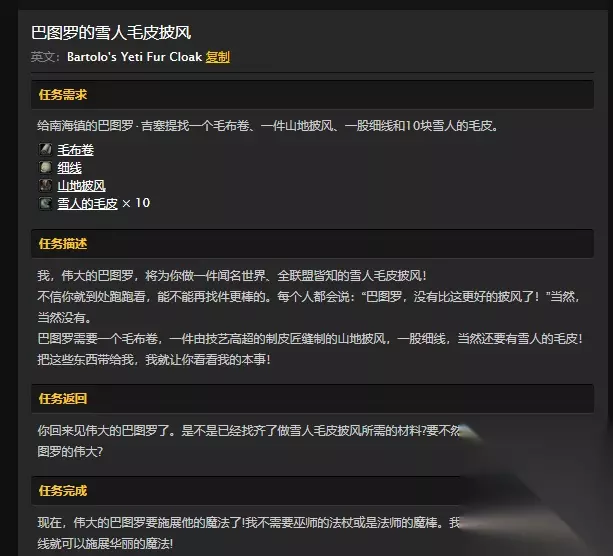 魔兽世界怀旧服南海镇巴图罗的雪人披风怎么做?WOW山地披风在哪儿?人类玩家在南海镇做任务的时候,会接到一个叫巴图罗的雪人披风的任务,里面需要的材料有些玩家不知道该去哪儿找,今天大玩家86来告诉大家巴图罗的雪人披风怎么做,山地披风在哪儿。具体内容如下: 巴图罗的雪人披风怎么做? 巴图罗的雪人披风任务要求四个任务物品。具体如下:
