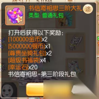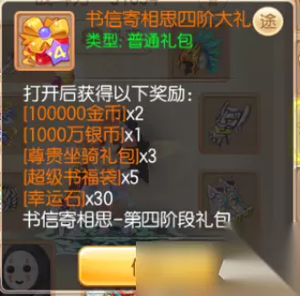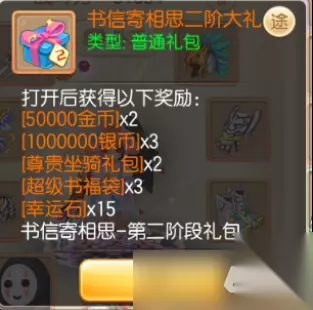 ①书信寄托相思 …暂别神州浩土21天及以上的少侠只要重新回归,即可开启本次回归福利活动。在本次活动中,少侠们可以通过累计登录、完成日常活动等方式逐步解锁四大阶段礼包,内含海量稀有道具~ 【一阶大礼包】