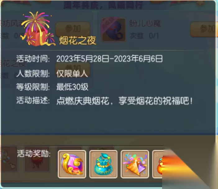 二、烟花之夜 2023年5月28日-2023年6月6日期间,神州浩土烟花之夜璀璨开启!少侠们快来点燃庆典烟花,享受烟花的祝福吧~