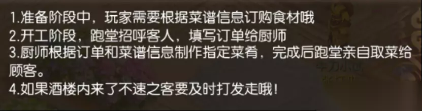 需要注意的是,本次活动为双人活动,需要参与活动的双方分别扮演“厨师”与“跑堂”,从订购食材开始共同制作美味佳肴。此外,由夫妻、师徒、挚友一起制作佳肴还能获取更高评价,进而解锁更好的奖励哟~不过有一点必须提醒各位少侠,恶客上门捣乱时大家需尽快驱逐,莫让其坏了就餐氛围!