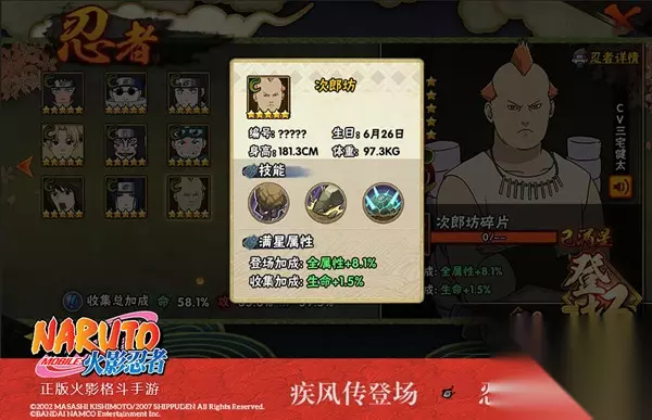 次郎坊 来自蛇洞的精英!四人众之次郎坊登场! 在音隐四人众中,次郎坊是最像木叶下忍秋道丁次的存在。他与丁次一样贪吃且体型肥胖,总是受到多由也的嘲笑。不过,身为大蛇丸贴身护卫的他,是强者如云的音隐村中之佼佼者。在木叶崩溃计划失败后,他以一已之力挑战鹿丸、鸣人、丁次三个下忍,并几乎以土遁·结界·土牢堂吸光三人的查克拉。而当这个强大的忍者以免费签到的姿态降临到学员身边,又会带来怎样的忍者格斗体验?