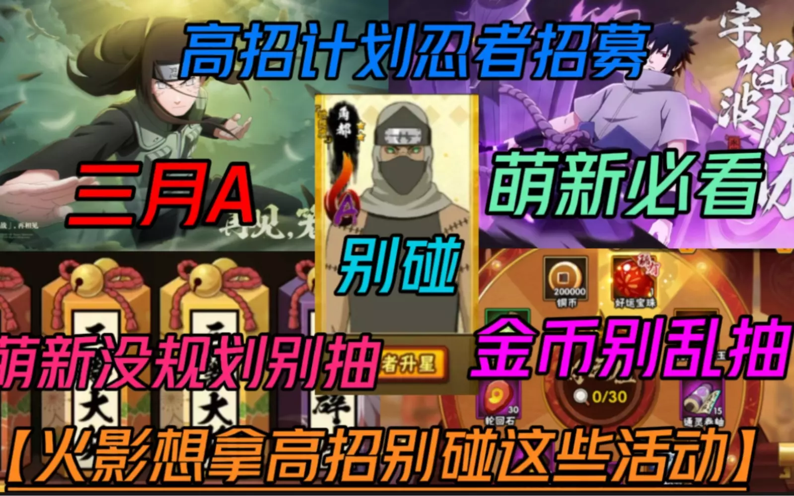这是一篇火影忍者手游的萌新向情报帖,针对0氪0金币的萌新,计算从当前到5月高招S、3月高招A上架时能存的金币数额,还展示了组织祈福、登录奖励等金币获取途径的收益。