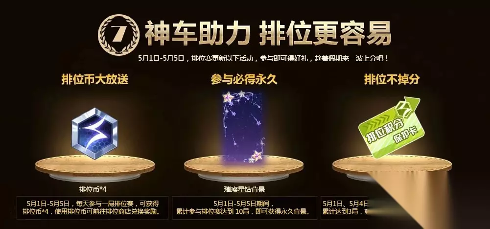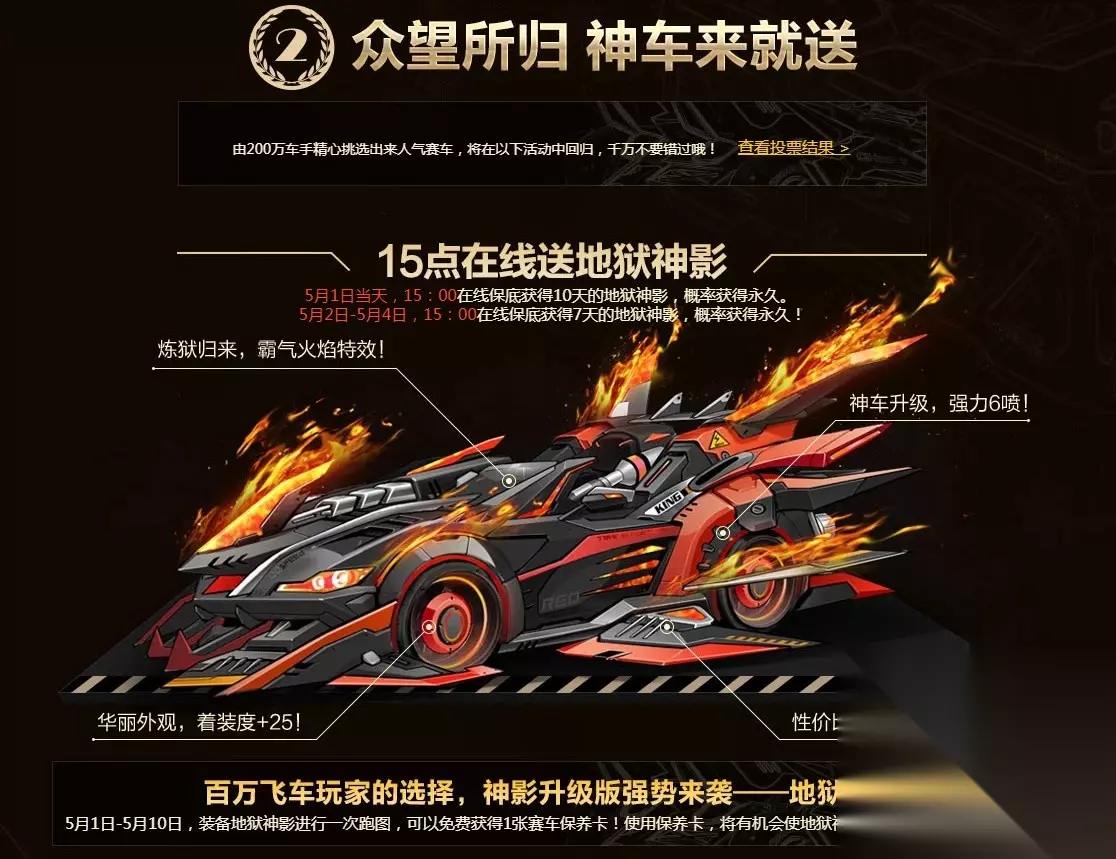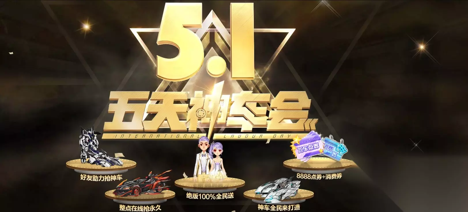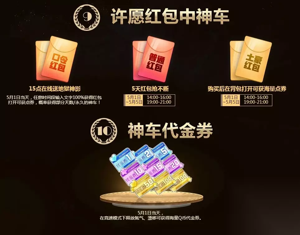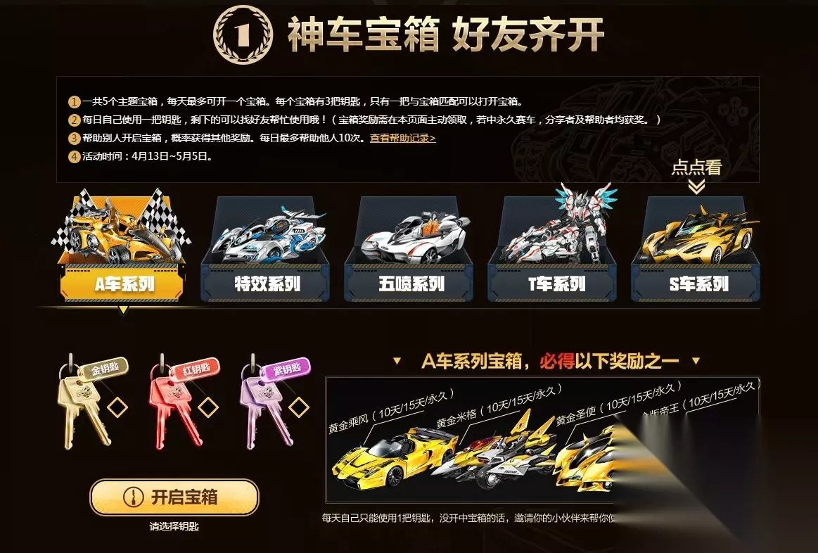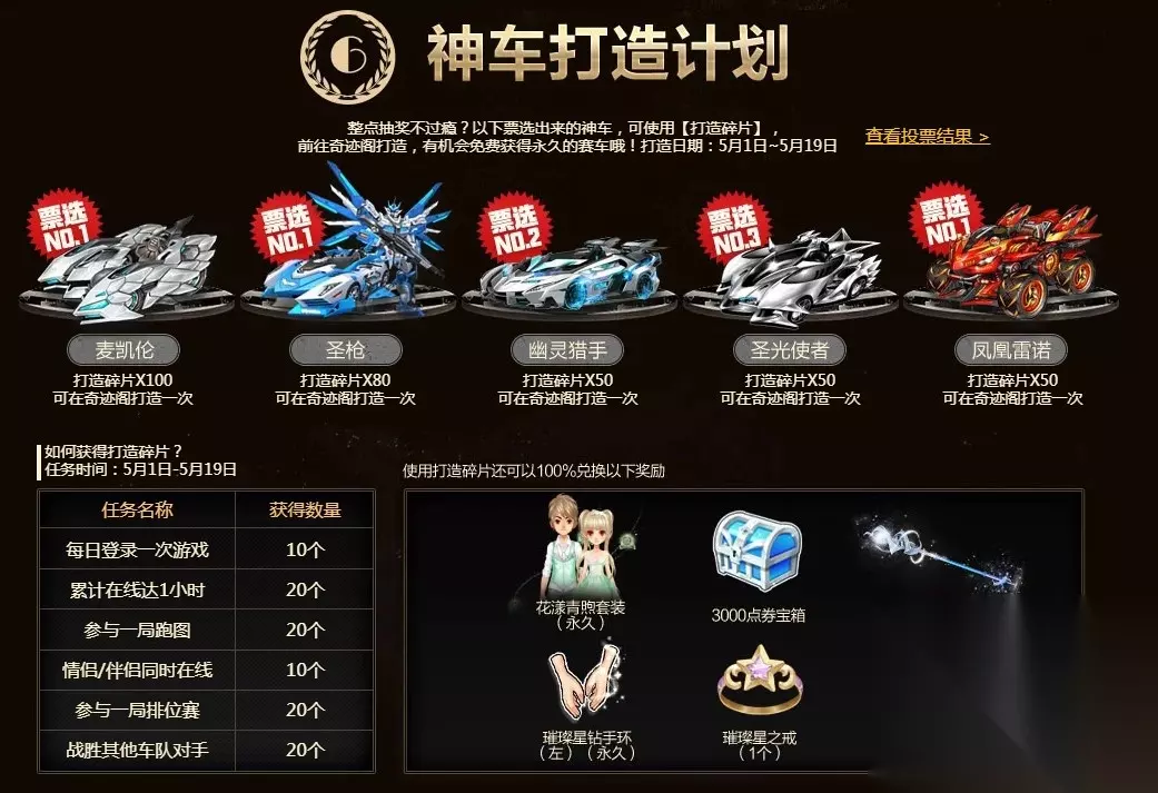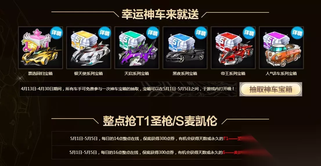 《QQ飞车》5.1五天神车会 活动时间:4月13日~5月5日 活动地址:点击进入 活动内容: