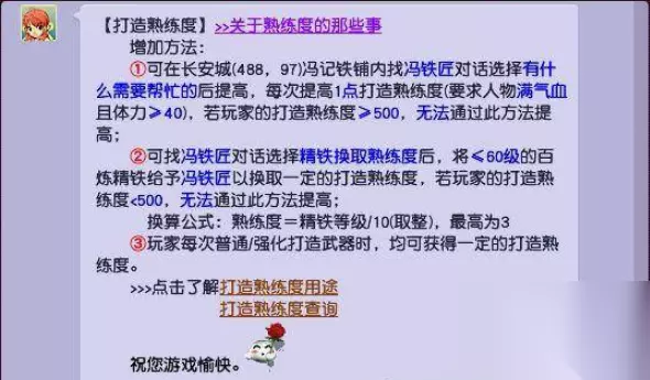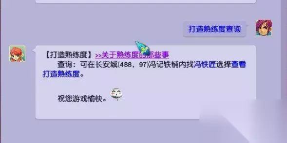 3、打造熟练度查询: 可以在长安城(488,97)冯记铁铺内找冯铁匠选择查看打造熟练度。