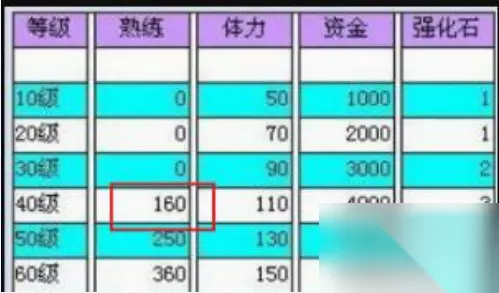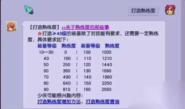 打造熟练度提升方法介绍: 1、熟练度: 各个等级分别需要打造熟练度是多少如下图: