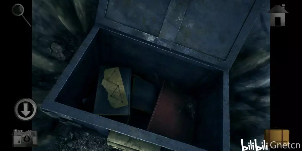 往回走一直来到过了河的小道,用钥匙打开道路左边的箱子拿走里面的「弓箭」和「弓弦」。接着到废墟那里,根据告示牌上的提示打开地下室的盖子。