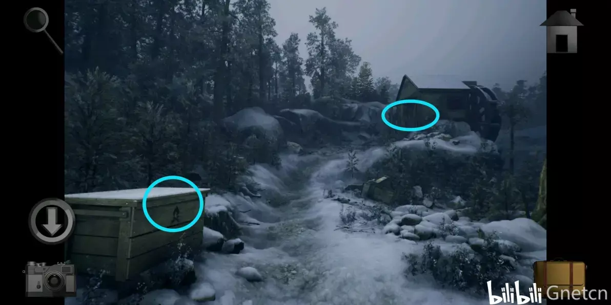 到第一个小木屋里将纸条碎片进行组合,观察上面的提示后到后面的小屋激活水车打开旁边的门,接着进去拿走里面的「手摇曲柄」。最后经过冰冻的河面来到缆索那里,用曲柄控制缆索到达对面。