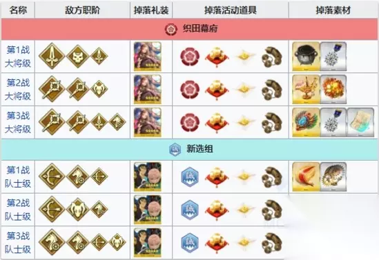 重点在于特殊新机制势力战,随着主线剧情,会解锁【三次】势力战副本:每次玩家都可以任意选择【织田幕府】和【新选组】的一边势力加入。 ◆活动加成表◆