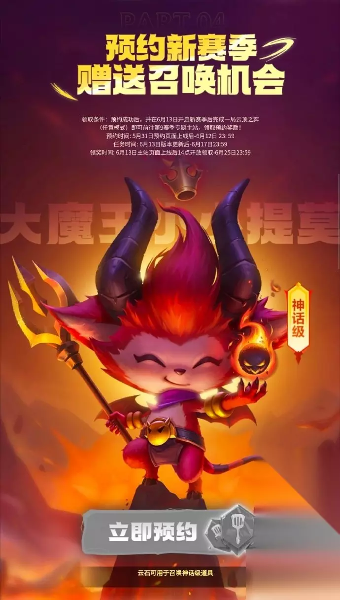 《云顶之弈》S9更新时间介绍 云顶之弈S9赛季国服上线时间为6月13日,正式服版本号为13.12 预约时间:5月31日预约页面上线后-6月12日 23: 59任务时间: 6月13日版本更新后-6月17日23:59 领奖时间:6月13日主站页面上线后14点开放领取-6月25日23:59
