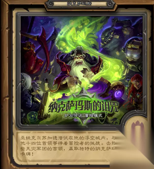 冒险模式有普通的卡牌奖励,通关英雄模式后有卡背奖励。 进入纳克萨玛斯的诅咒。