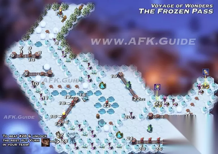 【具体流程】 1.2 需要按炮台发射两次,炸开前方的雪球,点燃9的炮台。 3.4 击败路上的敌人并拾取小宝箱 5.将爆竹向左移动一次 6.将炮台向左移动一次 7.炮台发射,并击中先前移动的爆竹,炸毁雪球。由于缺少雪球的压力,机关复位。 8.使炮台向右移动一次 9.发射炮台,击中冰面上的爆竹并引发连锁反应,从而使16上方的雪球炸开,可以继续前进。 10.11 击败路上的敌人并拾取小宝箱 12.将炮台向下移动一次,使炮台位于轨道中间 13.发射左上方轨道上的炮台,炮弹会点燃第12步移动的炮台。 14.将炮台向下移动一次,使炮台位于轨道底部 15.发射炮台,点燃右端的木桶,打开一条通道。 16.点击雪球发射器,发射的雪球将会卡在机关上,这样右边被冰面包围的炮塔将会出现一条道路。 17.移动炮台两次,使炮台位于轨道顶部。 18.发射炮台,点燃被冰面包围的炮台。 19.移动绿色传送门,使传送门位于轨道顶部 20.击败挡在路中间的敌人 21.移动炮台,使炮台位于轨道最左端 22.发射被包围的炮台,炮弹穿过传送门。点燃第21步移动的炮台。之后再次移动绿色传送门两次,使传送门位于轨道底部, 23.发射炮台,炮弹回穿传送门,击中机关周围的爆竹,炸开通路。 24.移动爆竹2次,使爆竹到达轨道最右端。 25.移动炮台,使炮台位于轨道最右端。发射炮台,点燃上方一连串的爆竹,炸开通路。 26.击败敌人获取两个大宝箱。 27.28隐藏宝箱需要在队伍中编入沃尔克或斯科雷格,然后击败28位置的特殊敌人才能拿到。两个英雄等级、品质不限,但是必须要上场,没有的可以找好友借一下。 【总结】