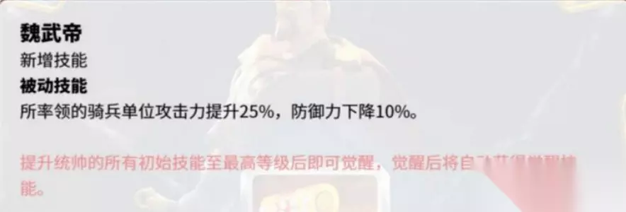 曹操的觉醒技,可以牺牲骑兵10%的防御力,用于提高骑兵25%的攻击,配合三技能可以把曹操的骑兵增益buff拉满。