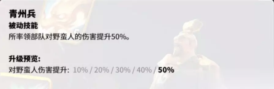 曹操的二技能:青州兵,可以提高军队对野蛮人的伤害,对打野有着很大的帮助,方便自己更快的打野,获得资源,提高自己的发育速度。