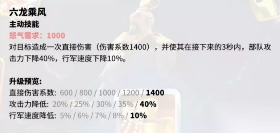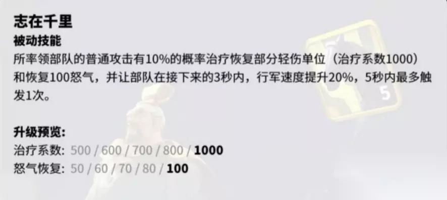 曹操的四技能:志在千里,曹操的普通攻击有10%的概率,为主将和副将恢复怒气,并提升行军速度,缺点就是概率有点低,属于欧皇专属技能。