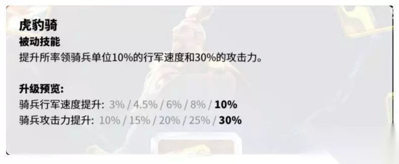 曹操的三技能:虎豹骑,该技能可以提高我方骑兵的行军速度和攻击力,对于骑兵的大幅度提升,就决定了曹操是一个十分出色的骑兵统帅,在统领骑兵作战时将会有着很大的优势。