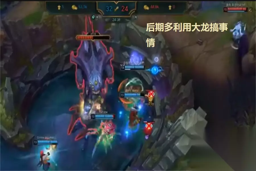 第三步,这个时候也就是中期,中期要干什么?控龙控峡谷,小龙看第一条刷出来的是什么品种的龙,如果是火龙优先击杀度很高,我们就要尽早偷掉这条小龙,记得在打龙的时候,在龙坑里面插上一个控制守卫。 另外很多玩家都不喜欢打峡谷先锋,这点非常不好,我们绝对要在早期把峡谷打掉,然后可以解放一条路,比方说我方上单很肥,优势很大,但是对方上单就显得很猥琐,无非在次击杀,并且对方上单是一个狗头那种的需要发育的英雄,我们就帮助我们的上单队友利用峡谷推掉对方的上塔,这样我们上单就解放出来了,然后在配合我们进行双游走,去帮助劣势路的队友。