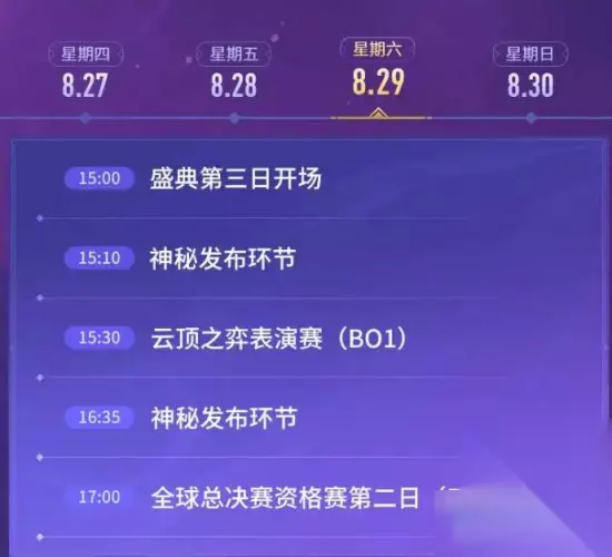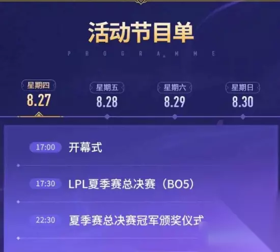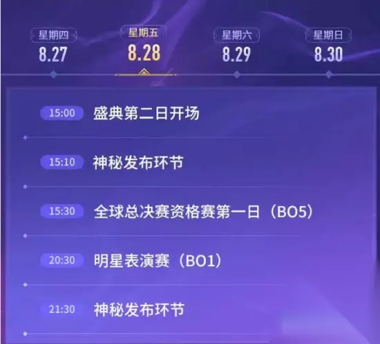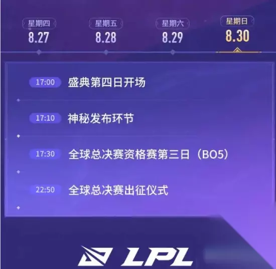 星期四 8月27日 17:00 开幕式 17:30 LPL夏季赛总决赛(BO5) 22:30夏季赛总决赛冠军颁奖仪式 星期五 8月28日 15:00 盛典第二日开场 15:10 神秘发布环节 15:30 全球总决赛资格赛第一日(BO5) 20:30 明星表演赛(BO1) 21:30 神秘发布环节 星期六 8月29日 15:00 盛典第三日开场 15:10 神秘发布环节 15:30 云顶之弈表演赛(BO1) 16:35 神秘发布环节 17:00 全球总决赛资格赛第二日(BO5) 星期日 8月30日 17:00 盛典第四日开场 17:10 神秘发布环节 17:30 全球总决赛资格赛第三日(BO5) 22:50 全球总决赛出征仪式