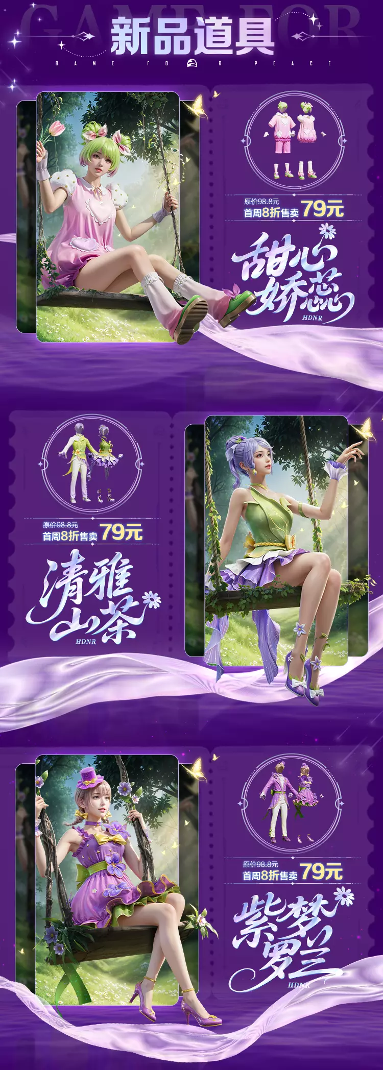 本期集市全新套装有【套装-紫梦罗兰】、【套装-甜心娇蕊】、【套装-清雅山茶】以及甜心娇蕊系列枪械皮肤、背包、头盔、背包挂件、降落伞等,并且首周将有8折优惠,不容错过!