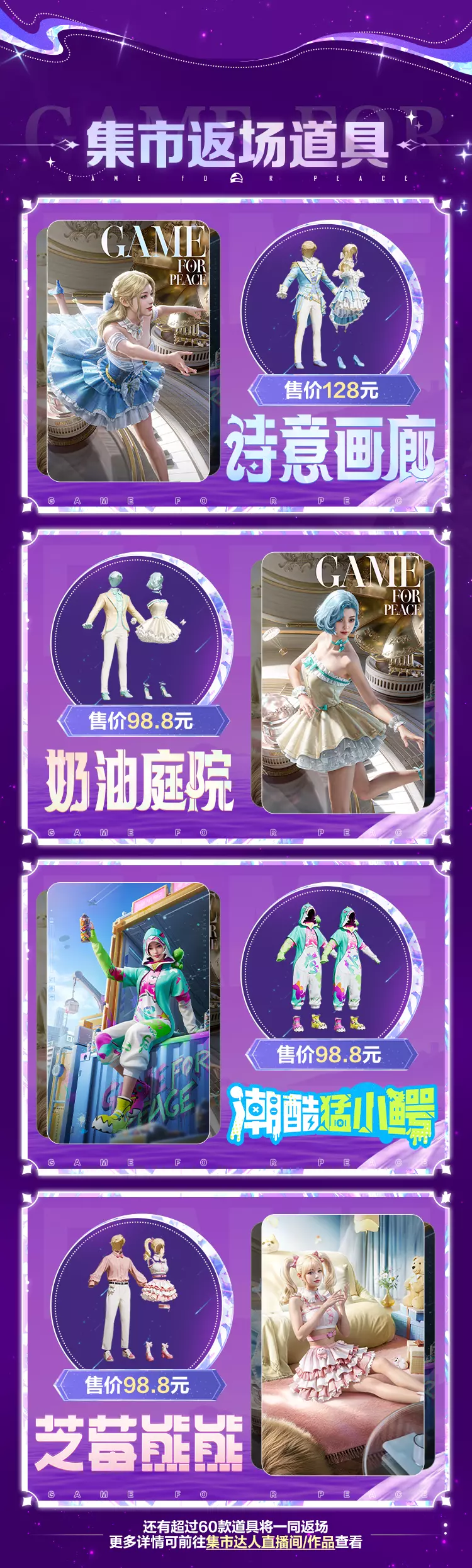 8月8日0点,将返场【套装-奶油庭院】、【套装-芝莓熊熊】、【套装-诗意画廊】等超过60款集市热门道具。