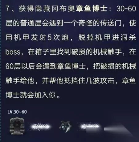 PS: 在箱子里找到破损的机械触手,在60层以后会遇到章鱼博士,把破损的机械触手给他,并帮他抵挡住几波攻击 隐藏冈布奥章鱼博士就会加入你